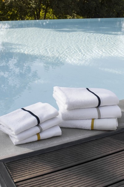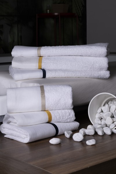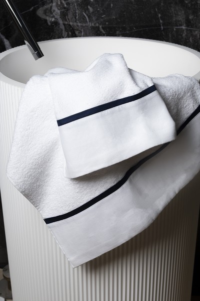 Set asciugamani 3 viso + 3 ospite in 100% spugna di cotone con bordi in puro lino 100% e piattina colorata in raso cotone