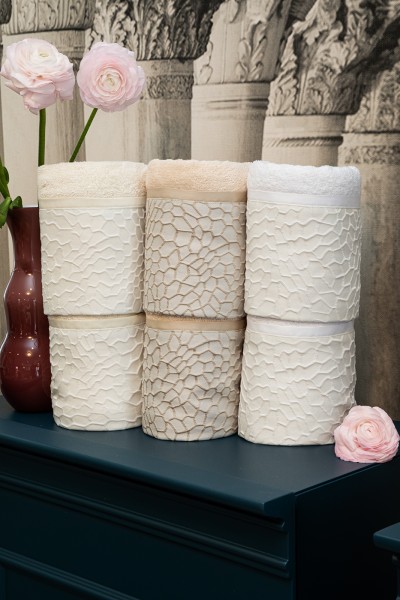 Set asciugamani 3 viso + 3 ospite in 100% spugna di cotone con bordi in tessuto jacquard.
