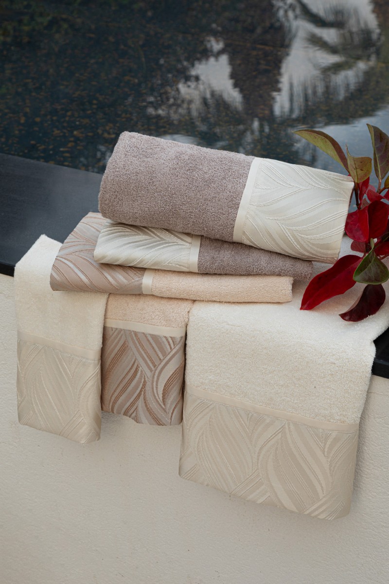 Set asciugamani 3 viso + 3 ospite in 100% spugna di cotone con bordi in tessuto jacquard e piattina in raso cotone.