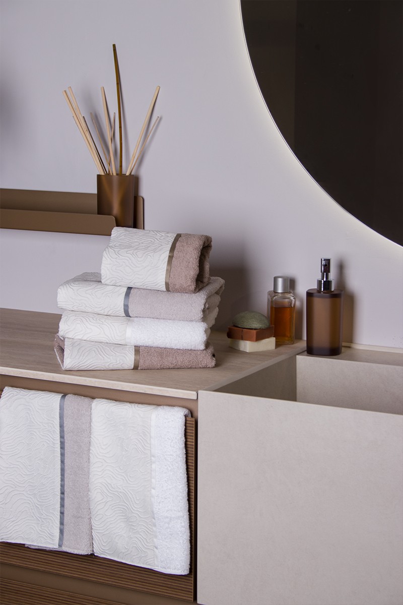 Set asciugamani 3 viso + 3 ospite in 100% spugna di cotone con bordi in tessuto jacquard.