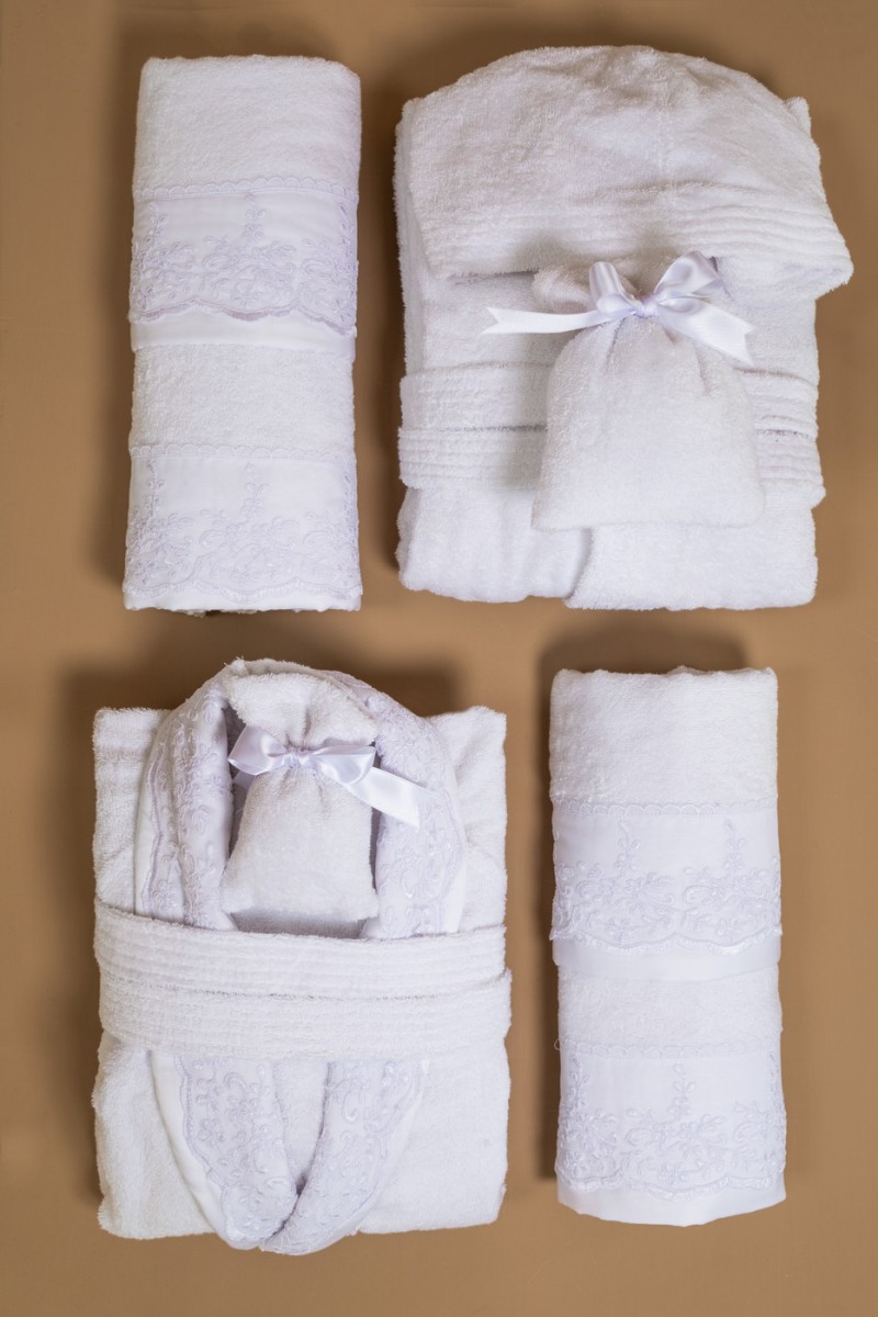 Completo da bagno in spugna di cotone con bordo in raso cotone 100% e pizzo in tulle ricamato. E’ composto da 2 accappatoi (di cui 1 con cappuccio), 2 asciugamani viso, 2 asciugamani ospite, 1 sacchetto per sali da bagno, 1 guanto per scrub.