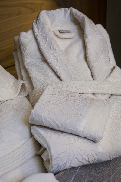 Completo da bagno per 2 persone in 100% spugna di cotone con bordi in tessuto jacquard disegno esclusivo con piattina in raso cotone. E’ composto da 2 accappatoi (di cui 1 con cappuccio), 2 asciugamani da viso, 2 asciugamani ospiti, 1 sacchetto per sali da bagno, 1 guanto per scrub.