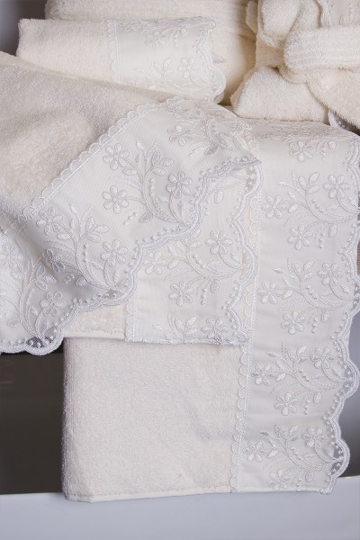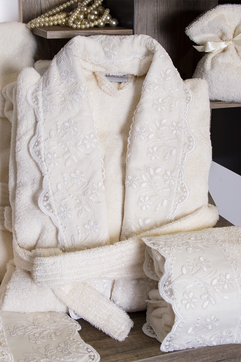 Completo da bagno per 2 persone in spugna di cotone con pizzo in tulle ricamato. Composto da 2 accappatoi (di cui 1 con cappuccio), 2 asciugamani viso, 2 asciugamani ospite, 1 sacchetto per sali da bagno, 1 guanto per scrub.