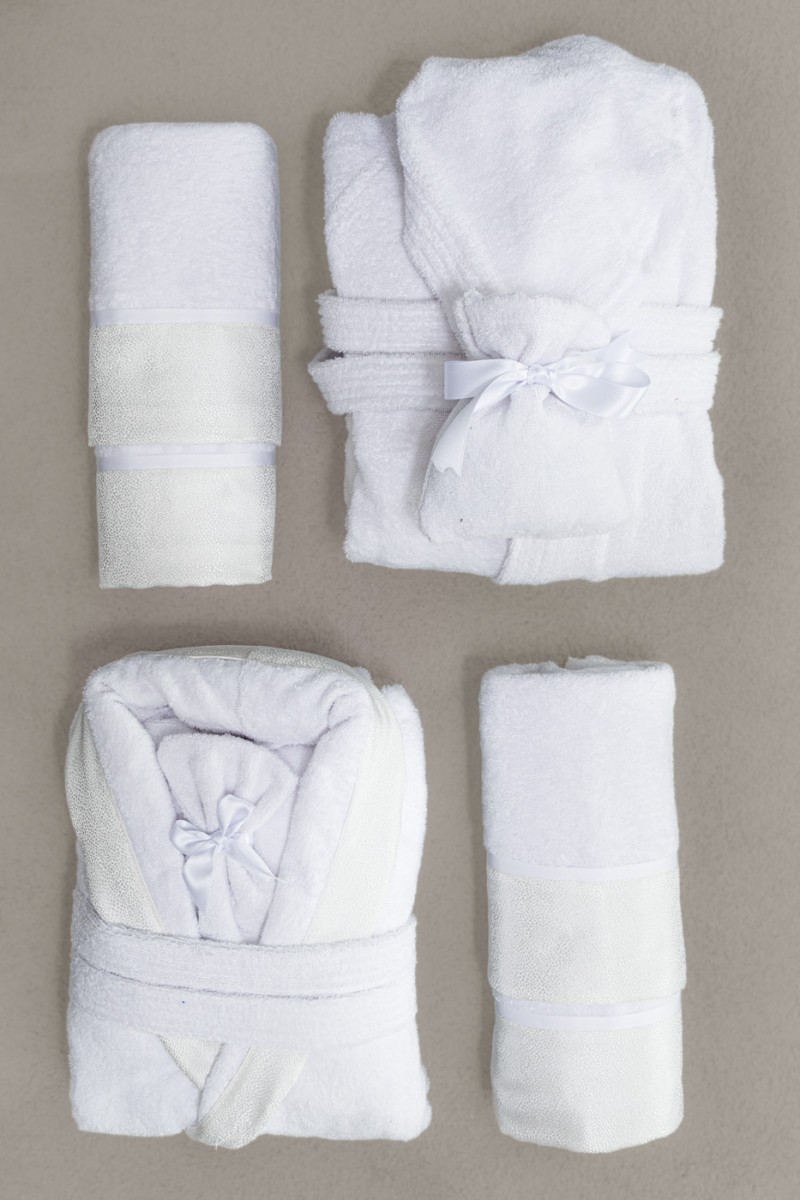Completo da bagno per 2 persone in 100% spugna di cotone con bordi in tessuto jacquard microdisegno con piattina in raso cotone. E’ composto da 2 accappatoi (di cui 1 con cappuccio), 2 asciugamani da viso, 2 asciugamani ospiti, 1 sacchetto per sali da bagno, 1 guanto per scrub.