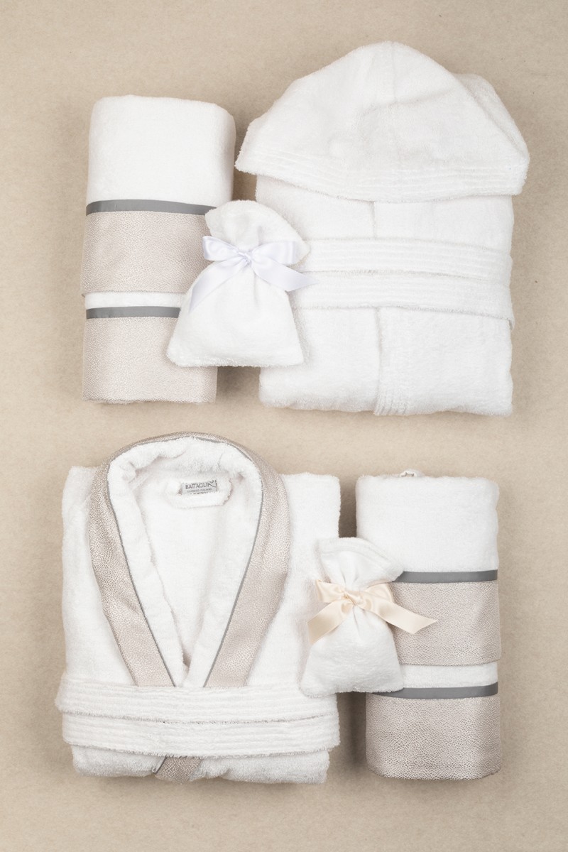 Completo da bagno per 2 persone in 100% spugna di cotone con bordi in tessuto jacquard microdisegno con piattina in raso cotone. E’ composto da 2 accappatoi (di cui 1 con cappuccio), 2 asciugamani da viso, 2 asciugamani ospiti, 1 sacchetto per sali da bagno, 1 guanto per scrub.
