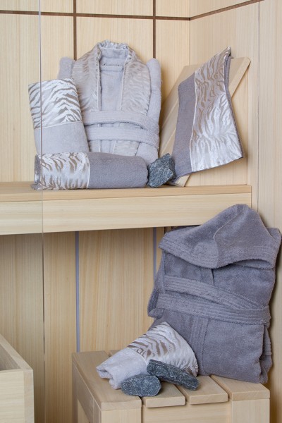 Completo da bagno per 2 persone in 100% spugna di cotone con bordi in tessuto jacquard. E’ composto da 2 accappatoi (di cui 1 con cappuccio), 2 asciugamani da viso, 2 asciugamani ospiti, 1 sacchetto per sali da bagno, 1 guanto per scrub.