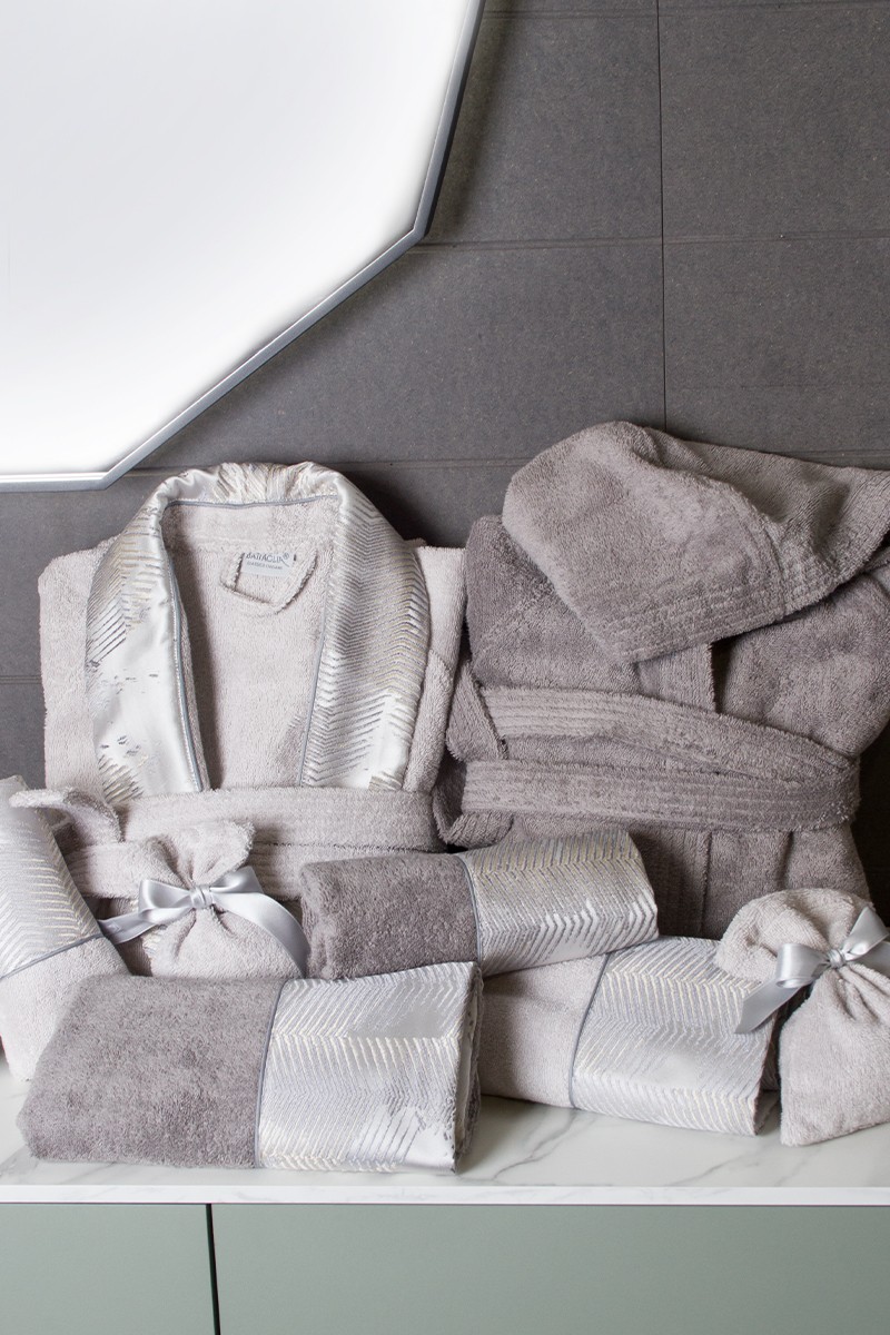 Completo da bagno per 2 persone in 100% spugna di cotone con bordi in tessuto jacquard. E’ composto da 2 accappatoi (di cui 1 con cappuccio), 2 asciugamani da viso, 2 asciugamani ospiti, 1 sacchetto per sali da bagno, 1 guanto per scrub.