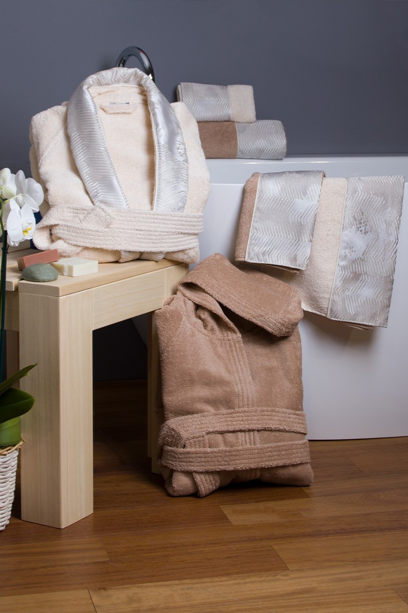 Completo da bagno per 2 persone in 100% spugna di cotone con bordi in tessuto jacquard. E’ composto da 2 accappatoi (di cui 1 con cappuccio), 2 asciugamani da viso, 2 asciugamani ospiti, 1 sacchetto per sali da bagno, 1 guanto per scrub.
