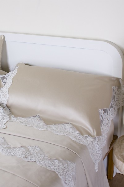 Completo letto in puro raso cotone 100% con applicazione di elegante pizzo rebrodè dalle nuance sofisticate. Realizzato artigianalmente.