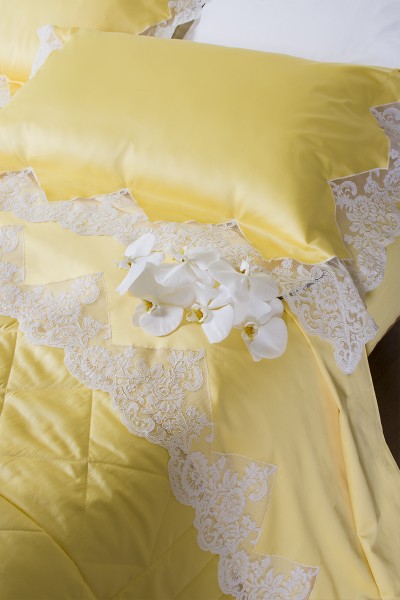 Completo letto in puro raso cotone 100% con applicazione di elegante pizzo rebrodè dalle nuance sofisticate. Realizzato artigianalmente.