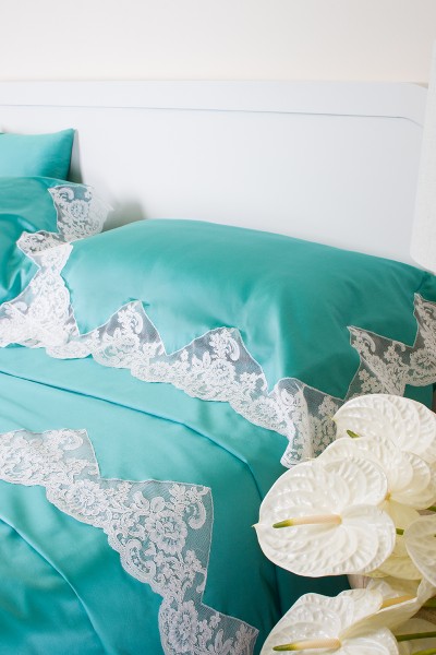 Completo letto in puro raso cotone 100% con applicazione di elegante pizzo rebrodè dalle nuance sofisticate. Realizzato artigianalmente.