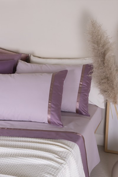Completo letto in tessuto 100% Puro Cotone con bordo lenzuolo e federe in raso di cotone impreziosito da nastro in raso a tinta. Realizzato artigianalmente e 100% Made in Italy.