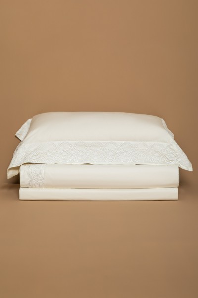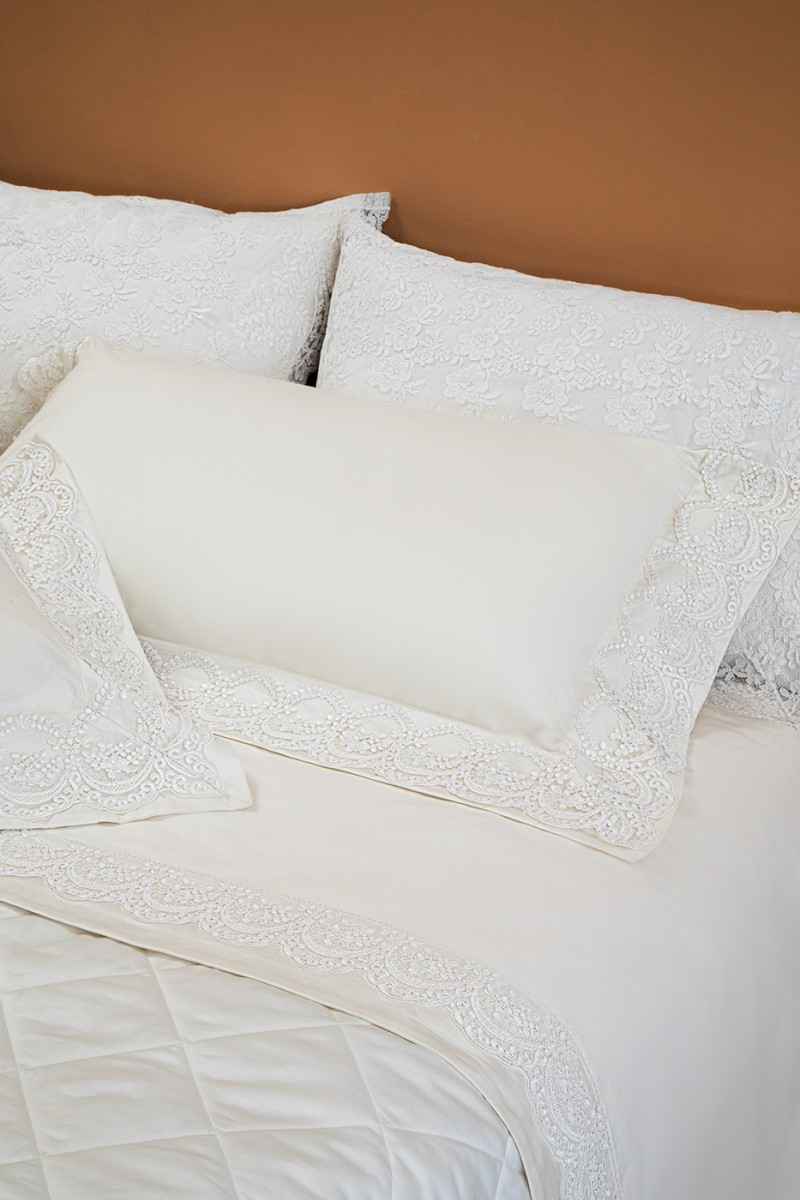 Completo letto in puro cotone 100% con applicazione di elegante pizzo in tulle ricamato. Realizzato artigianalmente.