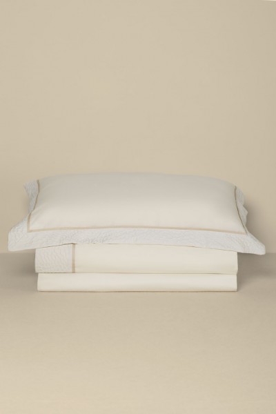 Completo letto in puro cotone con bordo lenzuolo e federe a tre lati in tessuto jacquard, piattina in raso cotone. Realizzato artigianalmente e 100% Made in Italy.