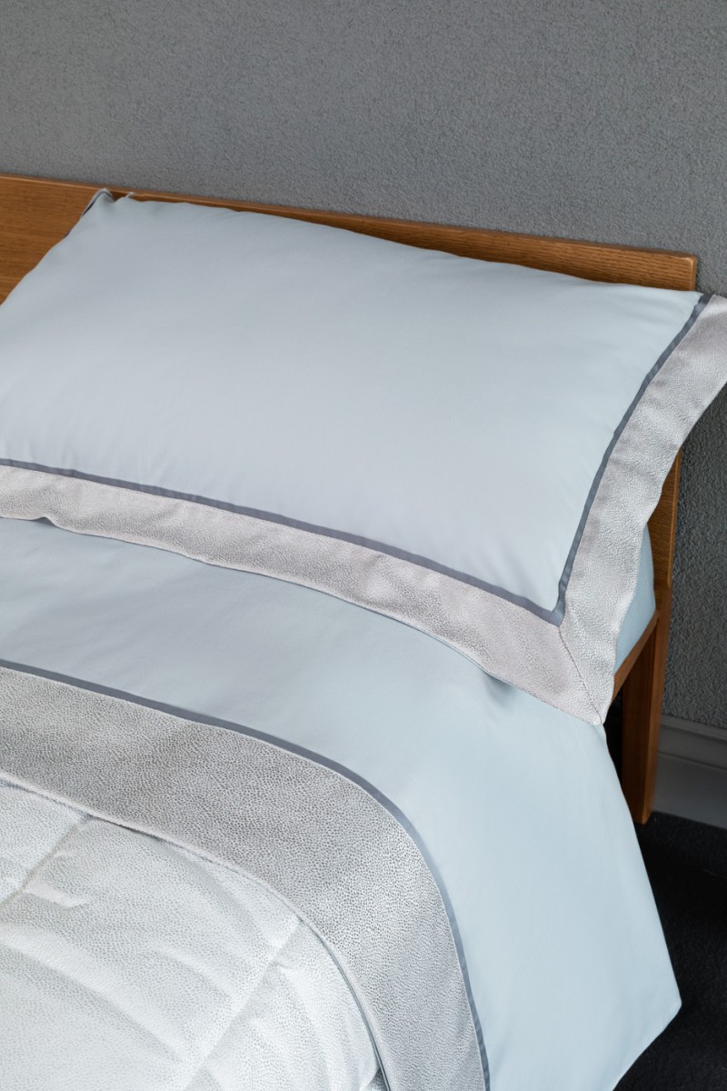Completo letto in puro cotone con bordo lenzuolo e federe a tre lati in tessuto jacquard microdisegno, piattina in raso cotone. Realizzato artigianalmente e 100% Made in Italy.