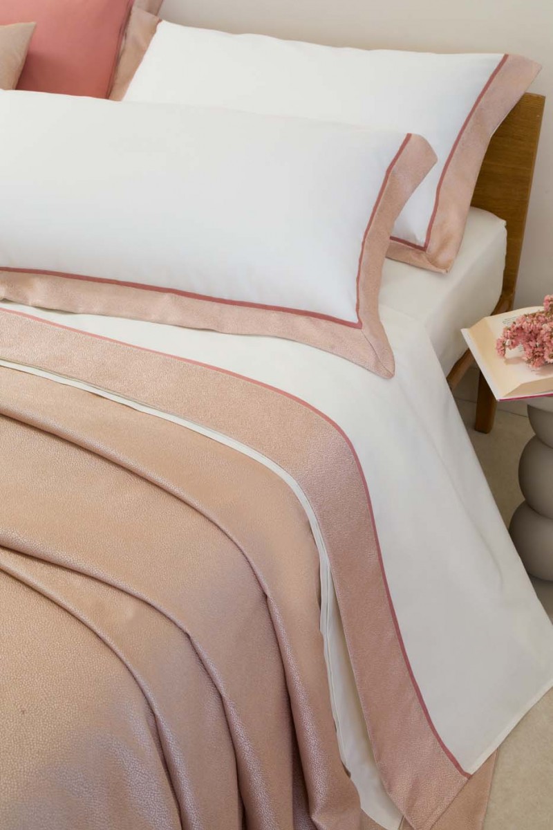 Completo letto in puro cotone con bordo lenzuolo e federe a tre lati in tessuto jacquard microdisegno, piattina in raso cotone. Realizzato artigianalmente e 100% Made in Italy.