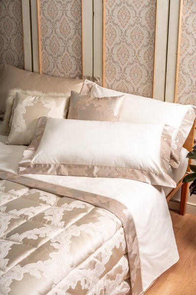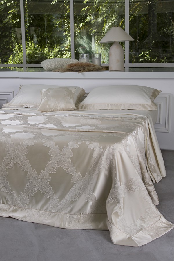 Completo letto in puro cotone con bordo lenzuolo e federe a tre lati in tessuto jacquard, piattina in raso cotone. Realizzato artigianalmente e 100% Made in Italy.