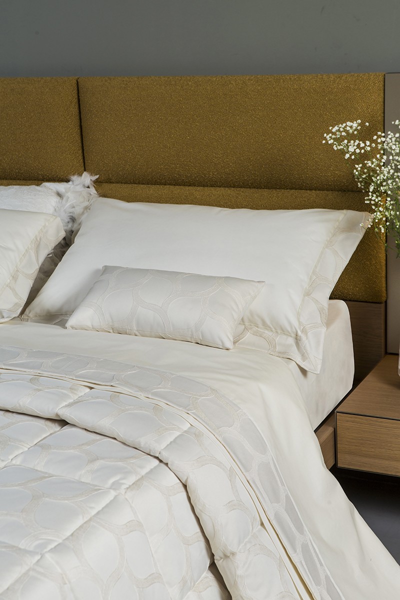 Completo letto 100% puro cotone con bordo lenzuolo e federe a tre lati in tessuto jacquard, piattina in raso cotone. Realizzato artigianalmente e 100% Made in Italy.