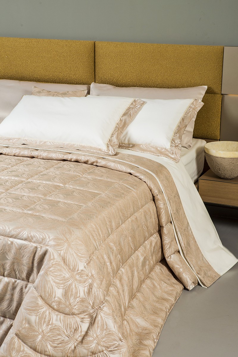 Completo letto 100% puro cotone con bordo lenzuolo e federe a tre lati in tessuto jacquard, piattina in raso cotone. Realizzato artigianalmente e 100% Made in Italy.