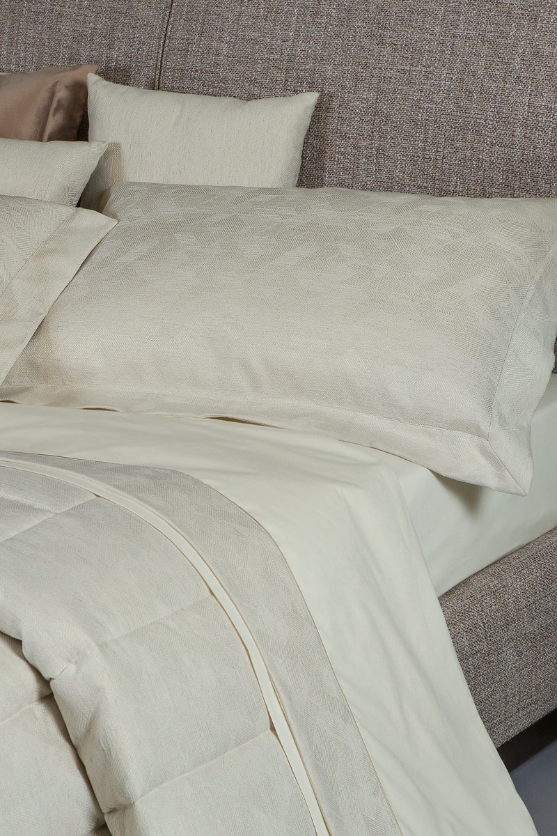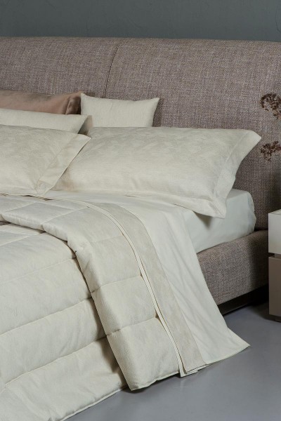 Completo letto in puro cotone 100% con bordo lenzuolo e soprafedere in tessuto jacquard Eco Green, realizzato artigianalmente e 100% Made in Italy.