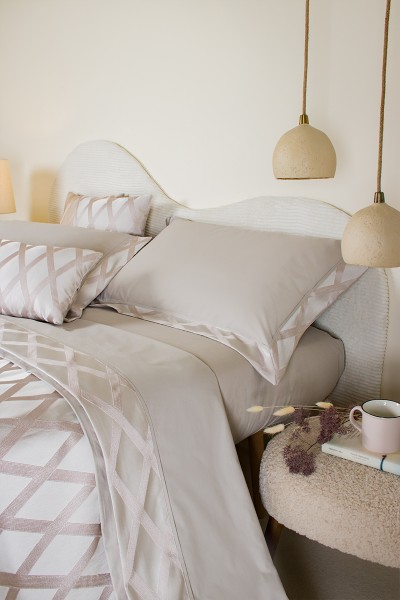 Completo letto in puro cotone con bordo lenzuolo e federe a tre lati in tessuto jacquard, piattina in raso cotone. Realizzato artigianalmente e 100% Made in Italy.