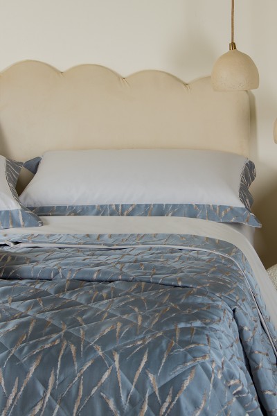 Completo letto in puro cotone con bordo lenzuolo e federe a tre lati in tessuto jacquard, piattina in raso cotone. Realizzato artigianalmente e 100% Made in Italy.