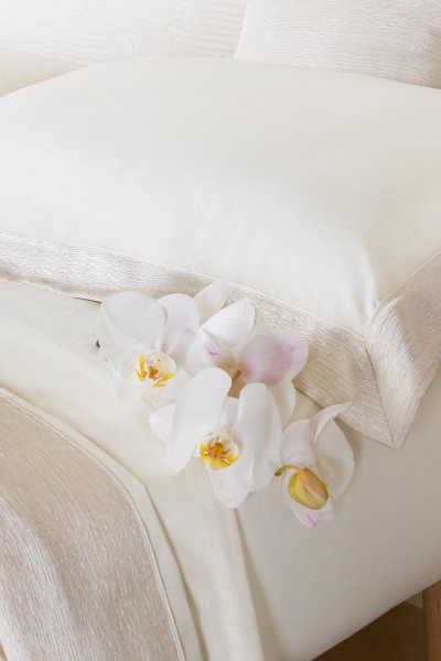 Completo letto in puro cotone con bordo lenzuolo e federe a tre lati in tessuto jacquard, piattina in raso cotone. Realizzato artigianalmente e 100% Made in Italy.