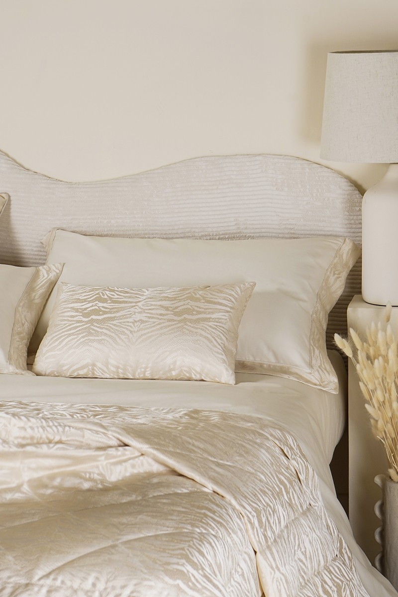Completo letto in puro cotone con bordo lenzuolo e federe a tre lati in tessuto jacquard, piattina in raso cotone. Realizzato artigianalmente e 100% Made in Italy.