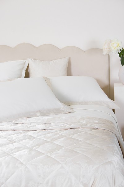 Completo letto in puro cotone con bordo lenzuolo e federe a tre lati in tessuto jacquard, piattina in raso cotone. Realizzato artigianalmente e 100% Made in Italy.