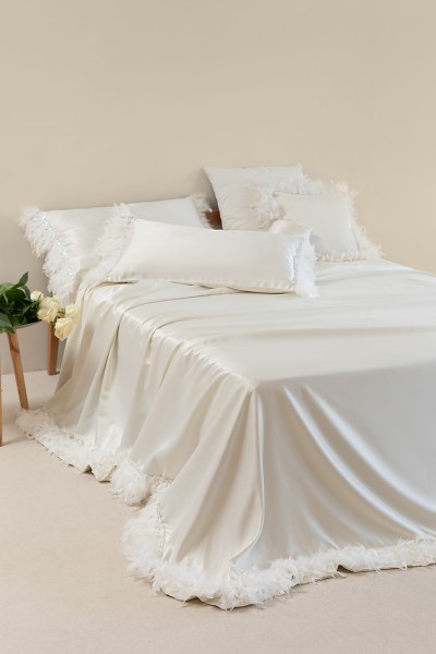 • Il Coordinato Letto Dama è composto da 1 lenzuolo superiore (270cm x 290cm) in puro cotone, 1 lenzuolo inferiore (180cm X 200cm) in puro cotone, 2 federe (50 cm X 80 cm)  in rasone con applicazione di piume e passamaneria, 1 copriletto (280 cm X 270 cm) in rasone mano morbida con piume e passamaneria.