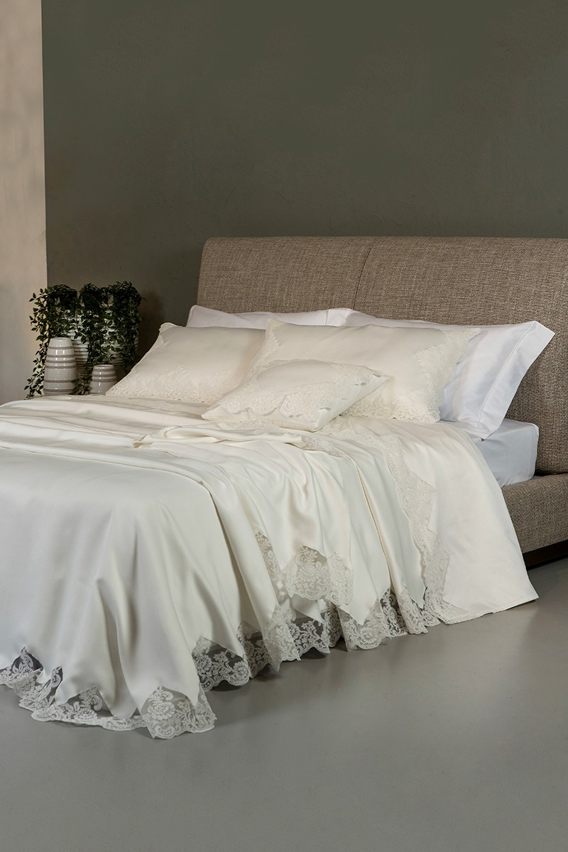 Coordinato letto matrimoniale in raso cotone 100% con copriletto in rasone mano morbida rifinito con prezioso pizzo rebrode'