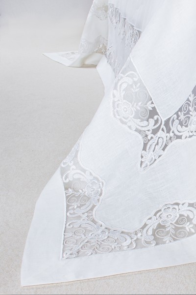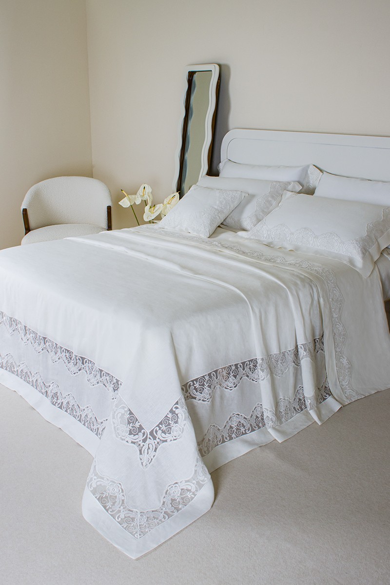 Coordinato letto matrimoniale in puro lino 100% rifinito con prezioso pizzo in tulle di cotone ricamato
