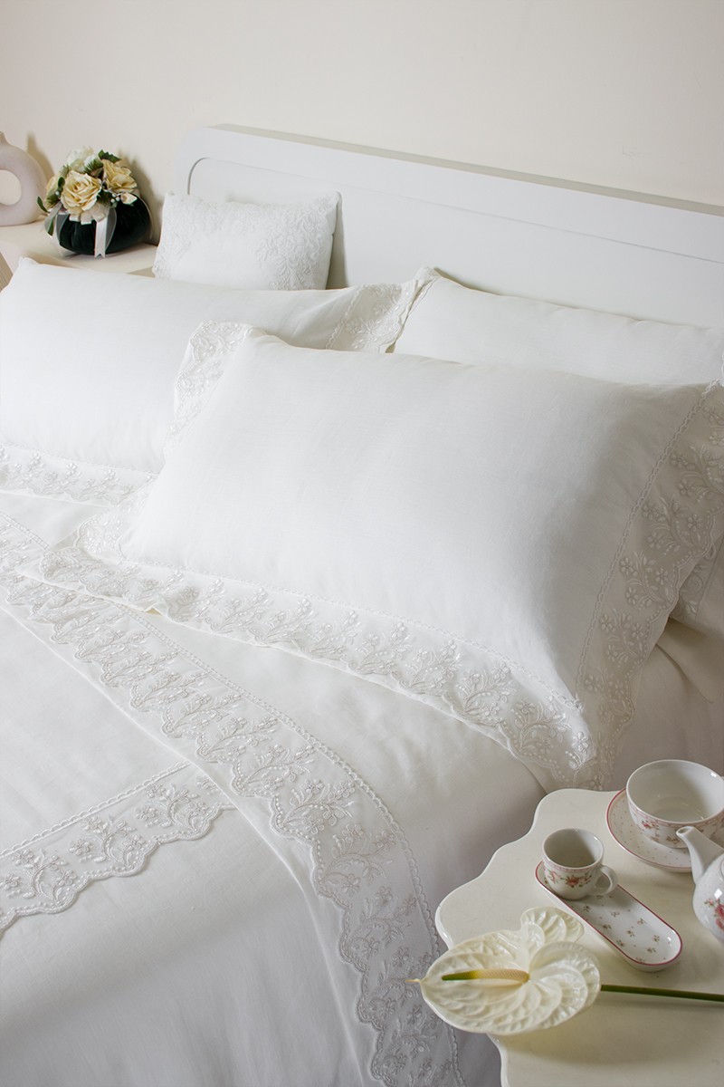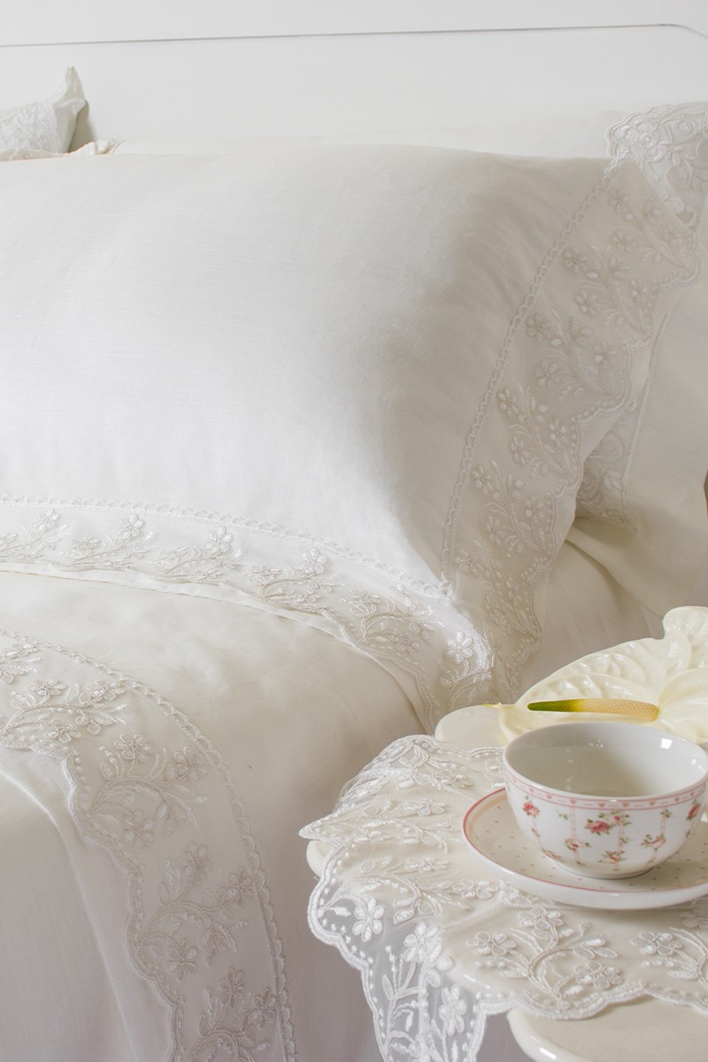 Coordinato letto matrimoniale in puro lino 100% rifinito con elegante pizzo in tulle di cotone ricamato