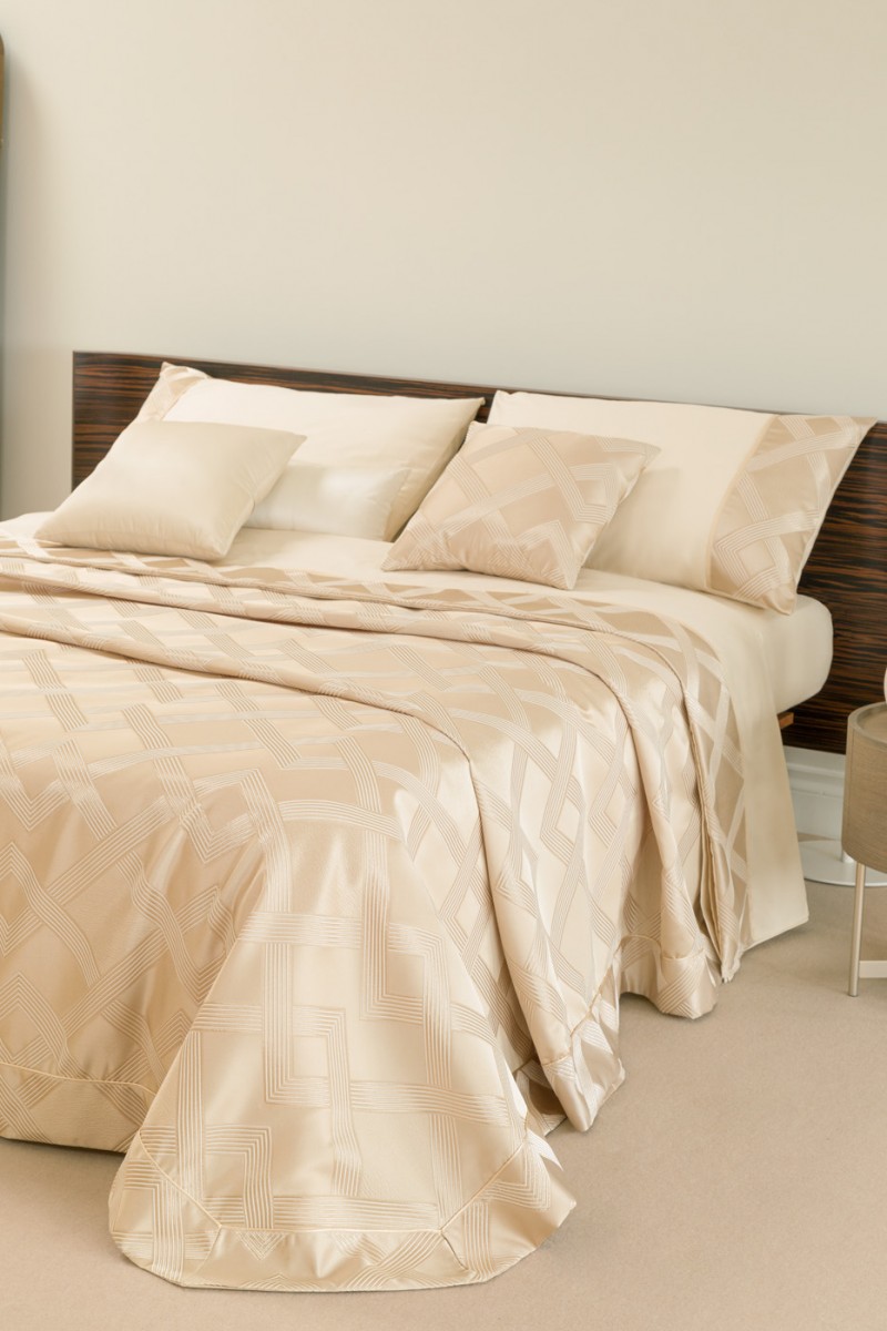 Copriletto in tessuto jacquard con bordo disegno esclusivo. Realizzato artigianalmente e 100% Made in Italy.