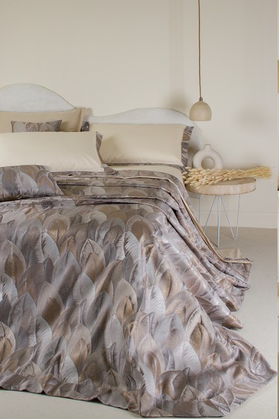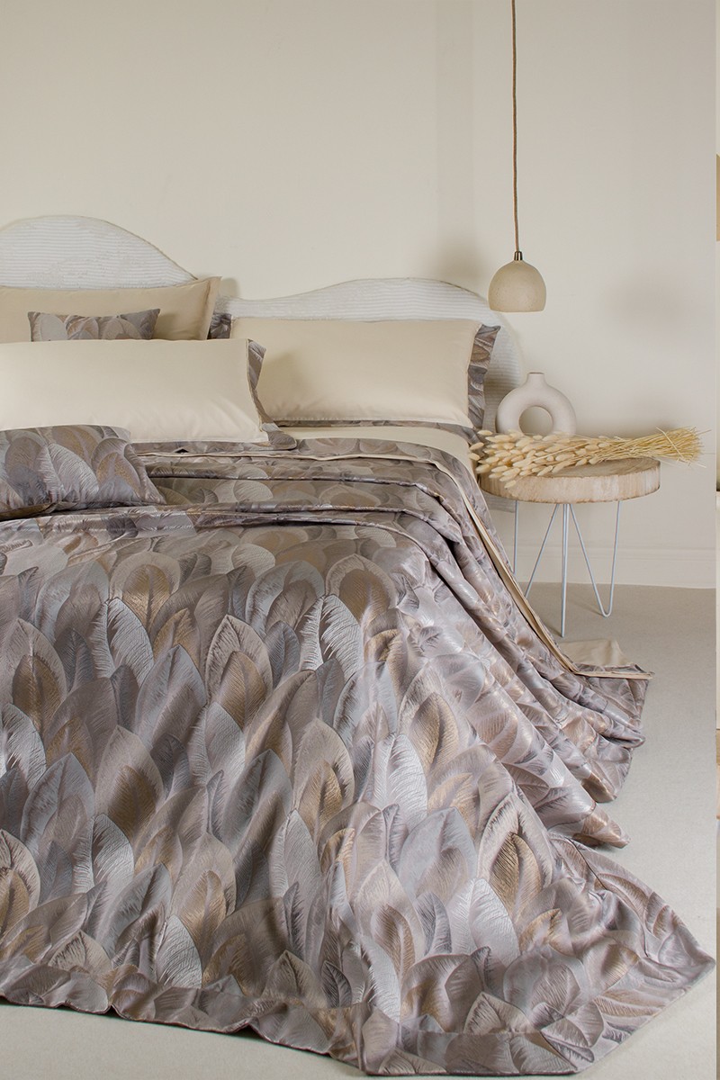 Copriletto in prezioso tessuto jacquard con un suggestivo motivo a piume sovrapposte. Realizzato artigianalmente e 100% Made in Italy.