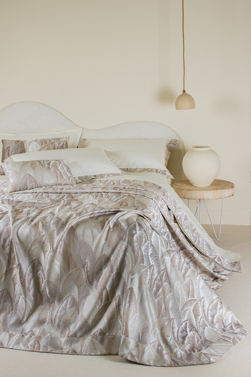 Copriletto in prezioso tessuto jacquard con un suggestivo motivo a piume sovrapposte. Realizzato artigianalmente e 100% Made in Italy.