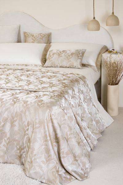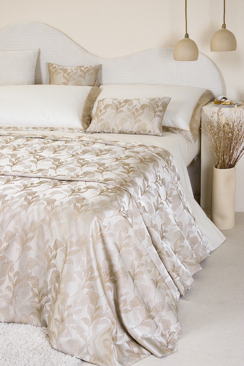 Copriletto in raso operato manoseta con bordo e angoli squadrati. Realizzato artigianalmente e 100% Made in Italy.
