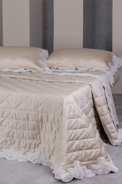 Trapuntino in raso cotone 100% con pizzo rebrodè disponibile in eleganti nuance. Realizzato artigianalmente.