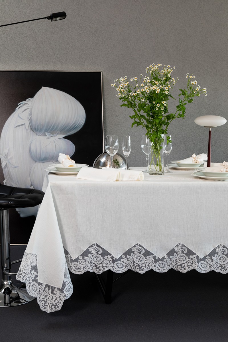 - Il servizio da tavola è composto da 1 tovaglia per 12 persone (180cm X 280 cm) in puro lino e con pizzo rebrodè + 12 tovaglioli mis. 48x48 in puro lino con pizzo rebrodè