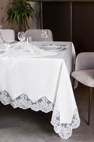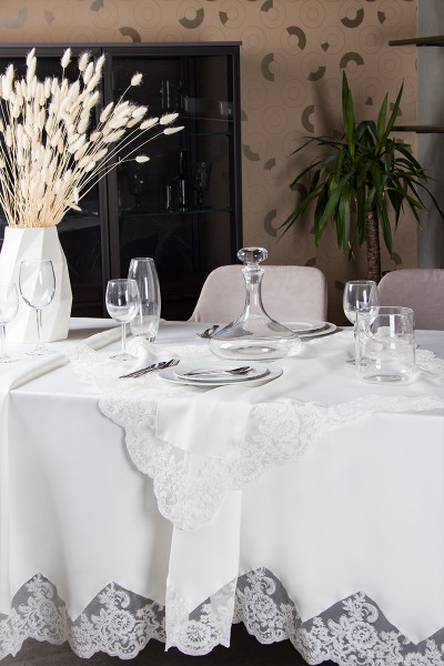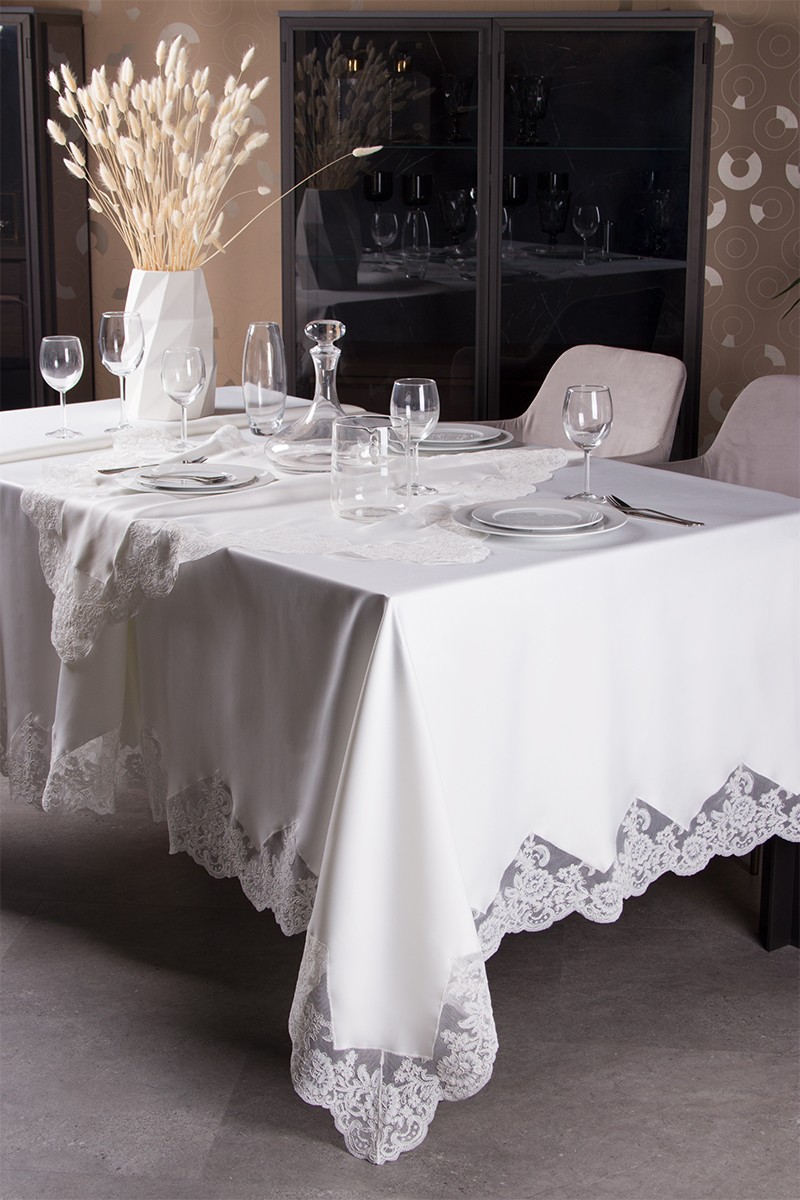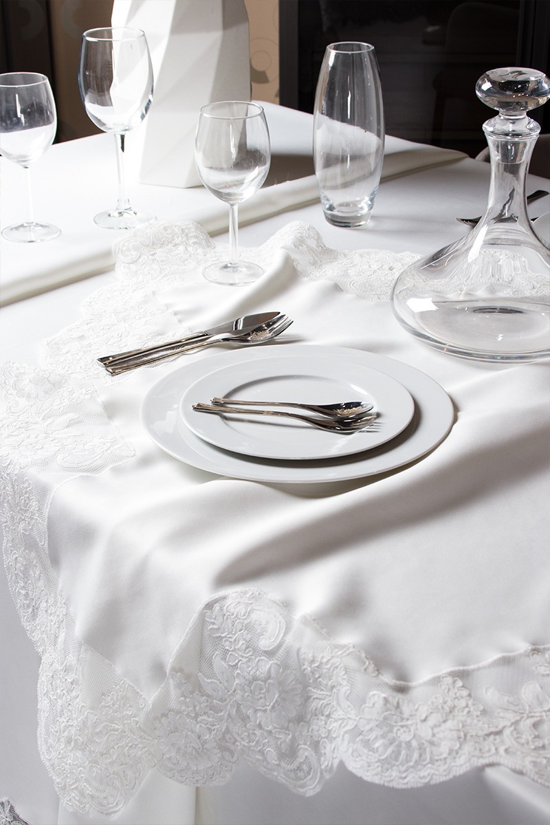 - Il servizio da tavola è composto da 1 tovaglia per 12 persone (180cm X 280 cm) in puro lino con pizzo rebrodè + 1 runner mis. 60x157 in puro lino e rebrode'