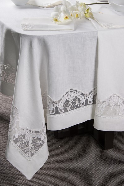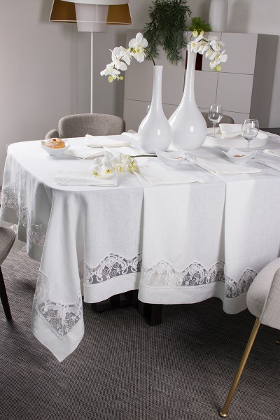 Servizio da tavola (tovaglia + 12 tovaglioli) in puro lino 100% con elegante pizzo in tulle di cotone ricamato. Realizzato artigianalmente.