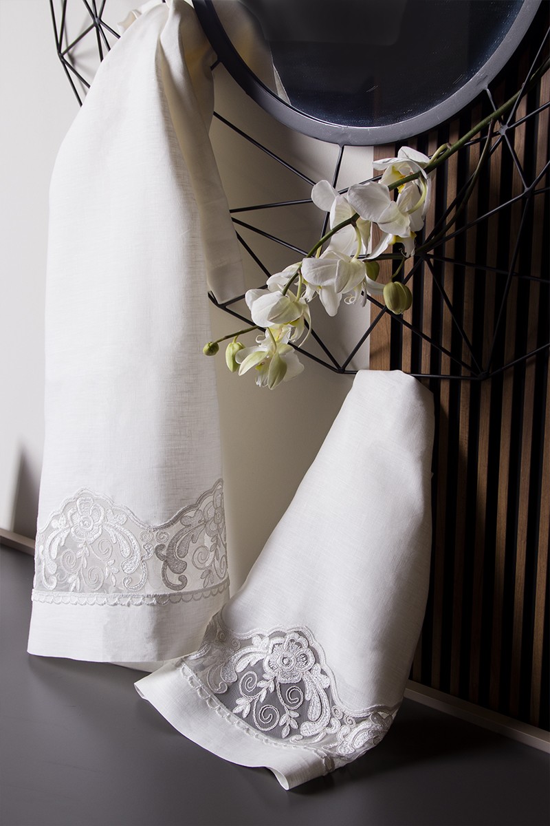 Set asciugamani in puro lino 100% con applicazione artigianale di pizzo in tulle di cotone ricamato.