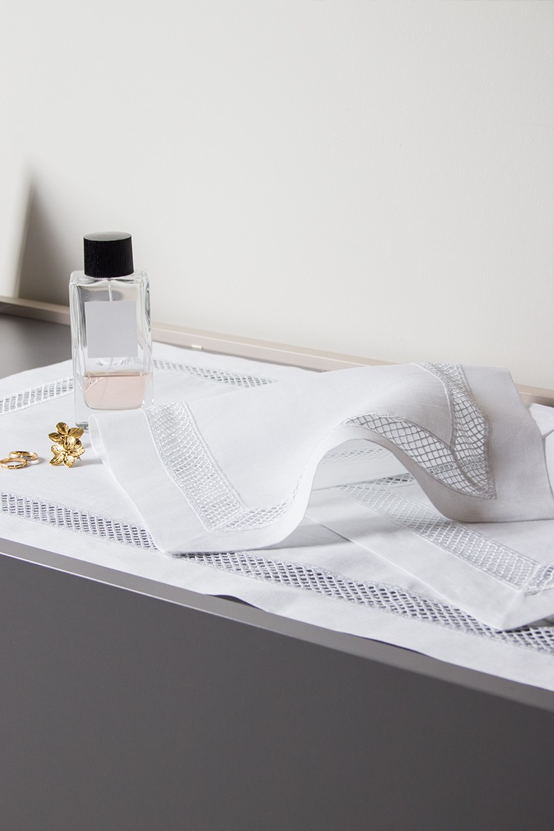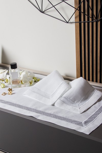 Set centri in puro lino 100% rifinito con semplice ma raffinato pizzo in cotone. Realizzato artigianalmente