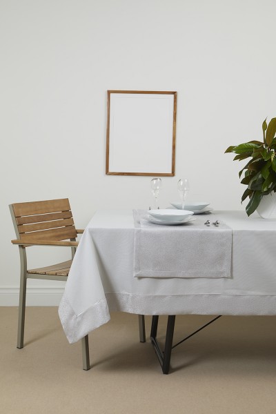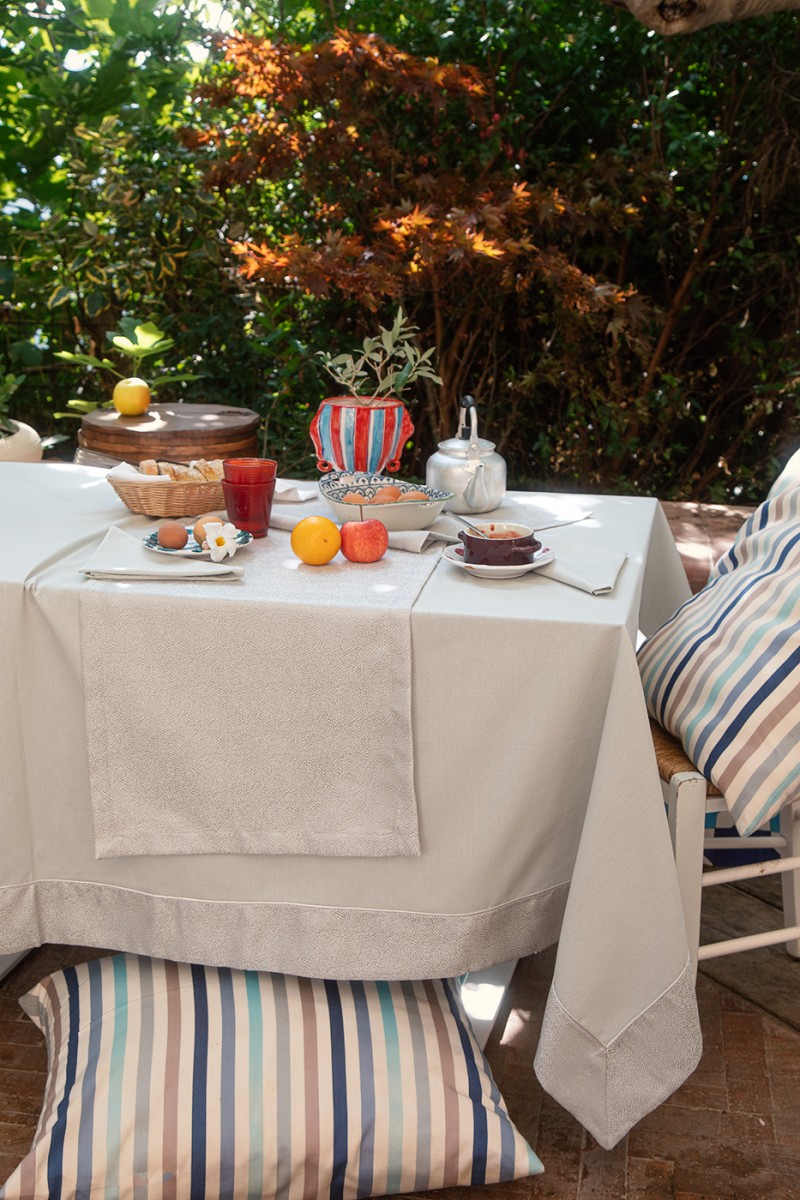 Set tovaglia con runner in panama tinto in filo di puro cotone di alta consistenza su armatura mattè, con bordo in tessuto jacquard microdisegno