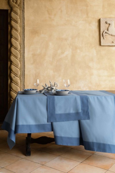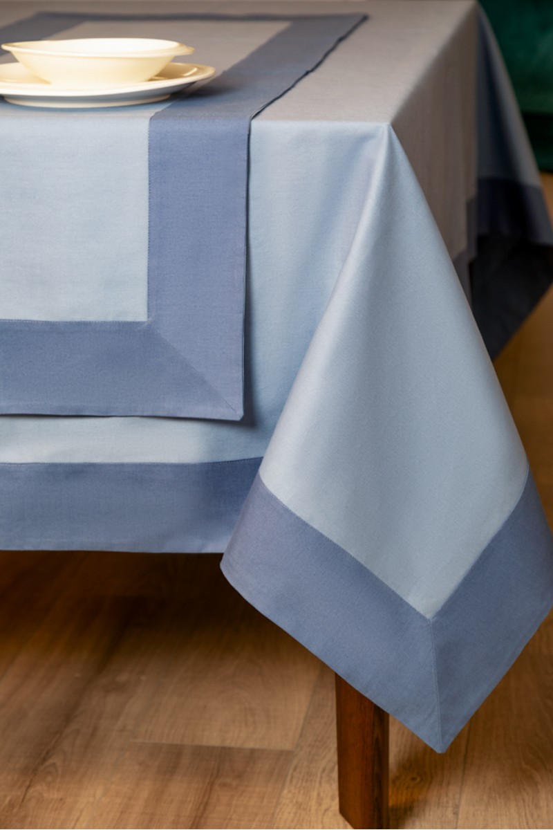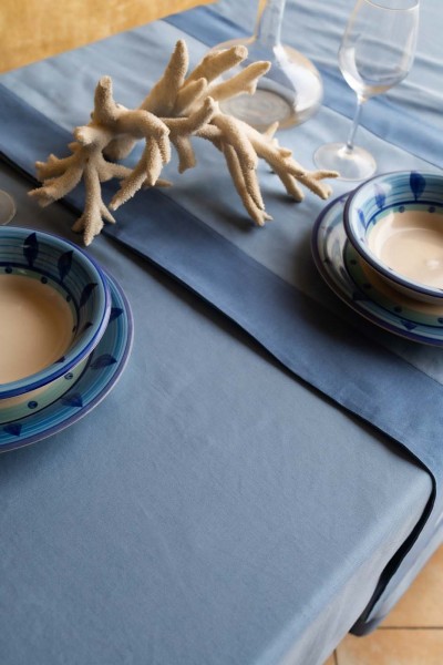 Set tovaglia con runner in panama tinto in filo di puro cotone ,alta consistenza su armatura mattè. Bordo a contrasto