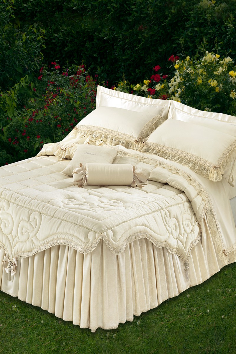 Trapunta 350 gr in alcantara con balze e pizzo macramè applicato, coordinata con 2 cuscini , fiocchi artigianali.