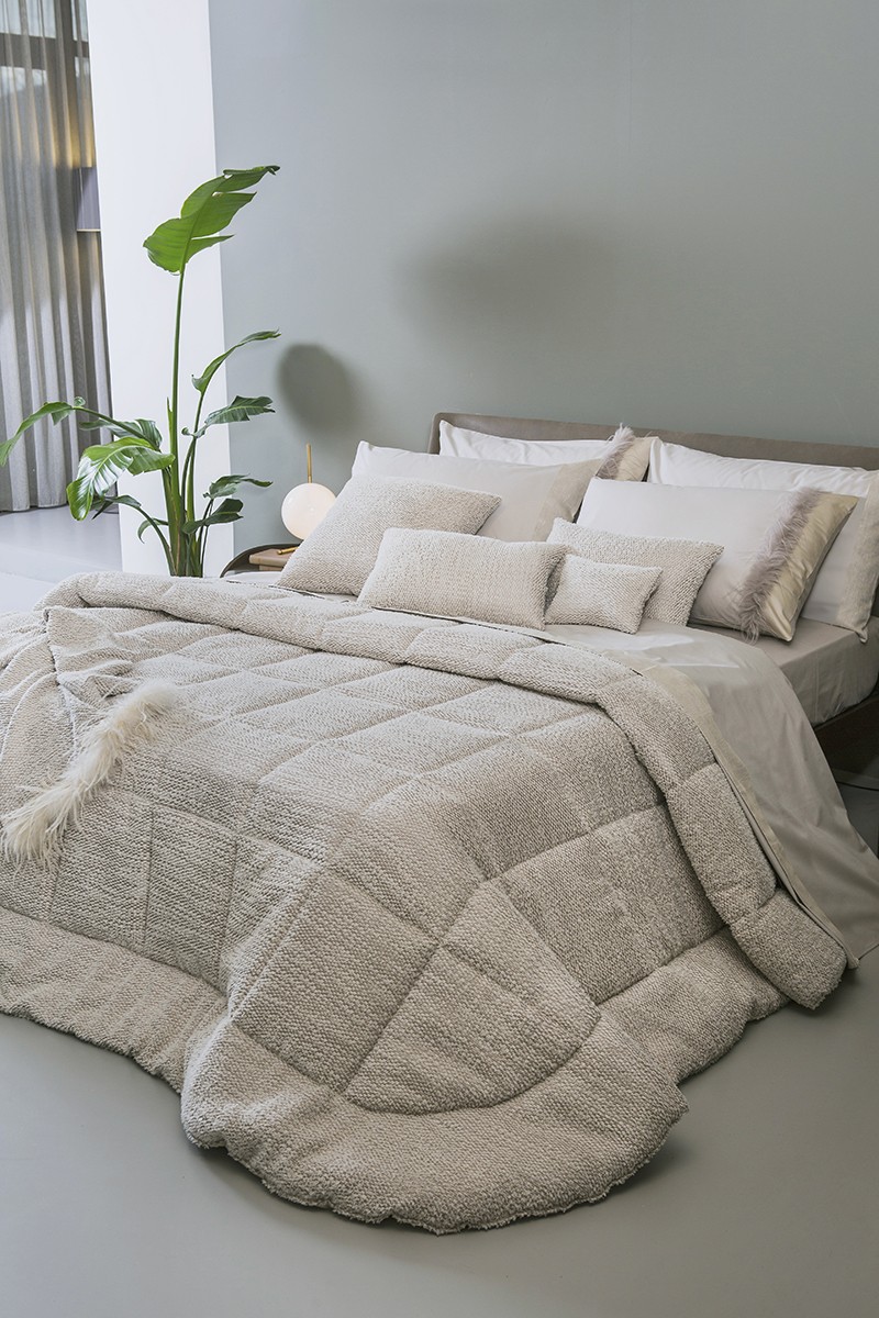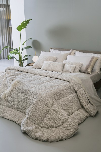 Trapunta dal design effetto tridimansionale e soffice, definita da un'ampia e generosa trapuntatura a maxi-quadri.