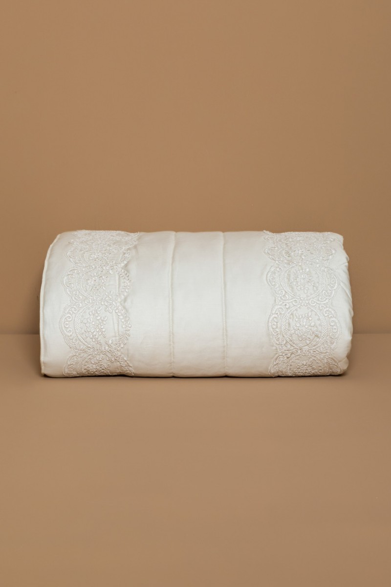 Trapuntino in raso cotone 100% impreziosito con elegante pizzo in tulle ricamato al pianoletto e al bordo. Realizzato artigianalmente.