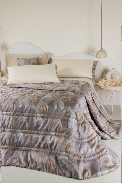 Trapuntino in prezioso tessuto jacquard con un suggestivo motivo a piume sovrapposte. Realizzato artigianalmente e 100% Made in Italy.